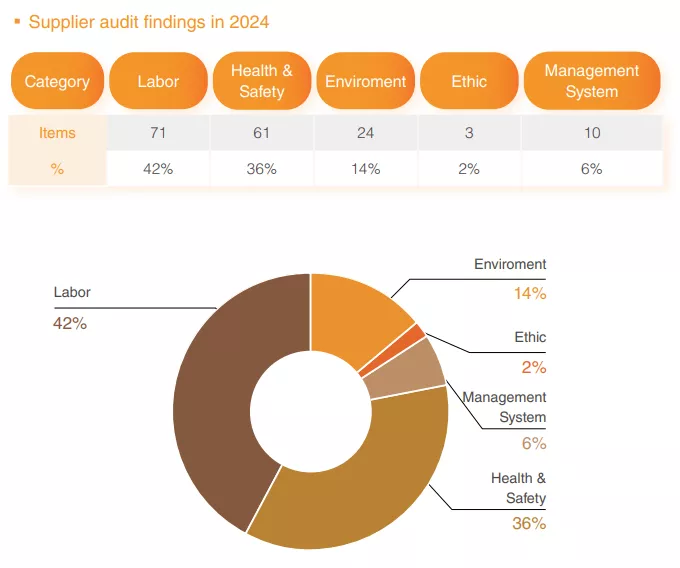 Simplo Technology conducts annual audits for the top 80% of suppliers by procurement amount. The audit team is composed of departments such as management, EHS, and sustainability. Audit methods include on-site inspections or remote document reviews. The RBA audit implementation principle prioritizes onsite audits for suppliers with manufacturing plants located in China. For suppliers located outside China and IC design firms not directly involved in production, remote audits are conducted. Simplo Technology conducted a total of 28 supplier audits in 2024. According to the audit results, they were divided into three levels of red, yellow, and green, and they were managed according to different levels. In the 2024 audit results, there were no red-light disqualified manufacturers. There were a total of 169 non-compliant issues identified, with the highest proportions found in the "labor" and "health and safety" aspects. These issues included overtime work violations, incorrect calculation of social security contribution base, inaccurate personal protective equipment allocation and fitting, and blocked emergency exits or evacuation routes. Regarding the non-compliant issues, suppliers have been requested to provide improvement plans and their implementation is being monitored to ensure all deficiencies are effectively addressed. In response to common deficiencies among suppliers, we have planned to conduct relevant courses to provide guidance and assistance for their improvement. This initiative aims to foster shared resources and mutual growth.