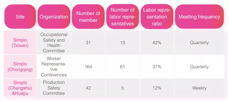 Simplo (Chongqing) has a "Production Safety Committee", which is composed of the general manager, department heads and safety officers. It meets every two months. It also has an "Employee Representative Conference" which meets once a year, including labor representatives. % accounts for 37%. Simplo (Changshu) also has a "Production Safety Committee" that holds weekly meetings with first-level supervisors to discuss occupational safety and health issues, in which labor representatives account for 12%.
