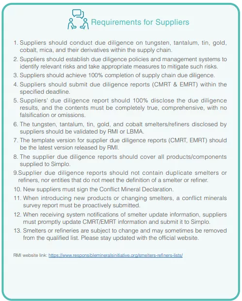 Simplo Technology requires suppliers to follow the "Due Diligence Guidance for Responsible Supply Chains of Minerals from Conflict-Affected and High-Risk Areas" published by the OECD and conduct due diligence based on this Guidance. At the same time, we have introduced RPA automation to regularly monitor the latest smelter information published on the RMI's official website, ensuring that our system maintains the most complete data. We adopt automation management on a rolling basis to ensure that the submitted data from vendors complies with the latest regulations and customer requirements.