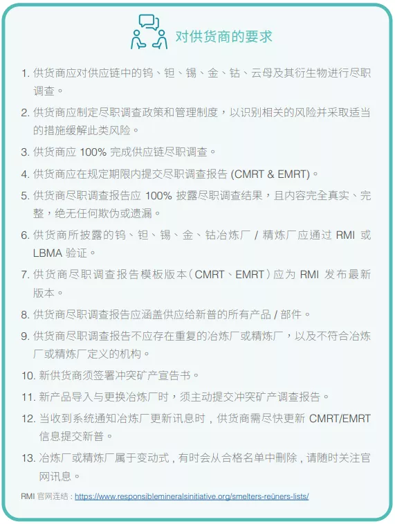 新普科技要求供货商遵循 OECD 所发布的「 受冲突影响地区和高风险地区矿产供应 链的尽职调查指导方针 」,并依据该指导原则开展尽职调查,同时也导入 RPA 自动化定时侦测 RMI 官网最新公布冶炼厂讯息,保持系统最完整的资料,采用滚动式自动化管理将已不存在合格冶炼厂的调查表重启系统通知供货商展开再次调查, 确保厂商提交资料符合最新法规与客户要求。