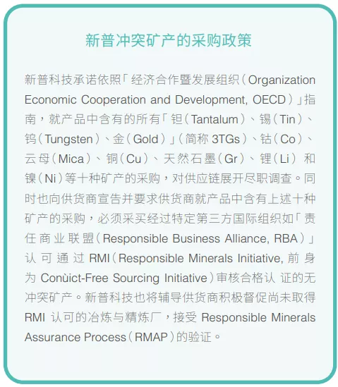随着欧盟电池法规对优先矿物供应链透明度要求的提高,自 2025 年起,新普科技将对主要关键材料的供货商展开附加矿物报告模板( Additional Minerals Reporting Template, AMRT )调查,涵盖铜( Copper )、石墨( Graphite )、锂( Lithium )及镍( Nickel )四种矿物的尽职调查,进一步推动供应链的透明化与负责任的资源采购。