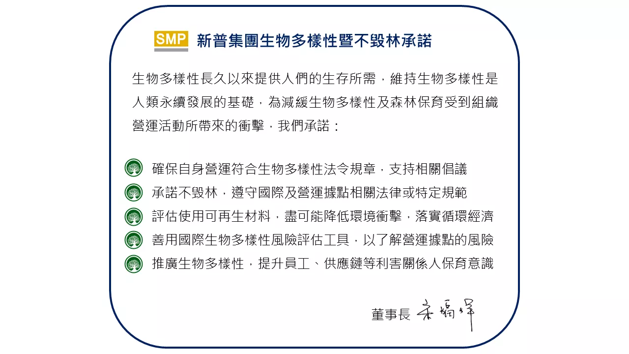 2021 年聯合國及國際組織合作推出 TNFD 倡議(Taskforce on Nature-related Financial Disclosures, TNFD),目的在於提高與自然相關的金融風險透明度,將自然融入金融和商業決策,已於 2023 年 9 月發佈 TNFD 報告書框架。新普科技檢視自身營運據點及其鄰近地區非屬自然生態保護區或環境敏感地區,因此對生物多樣性無顯著直接或間接衝擊。新普科技掌握國際永續趨勢,持續於營運中進行環境管理,以降低對自然生態系統的影響。訂定「新普集團生物多樣性及森林保育承諾 」,透過內部永續電子報對全體員工宣傳維護生物多樣性的重要性,亦規劃對供應商進行溝通,提升生態保育意識。