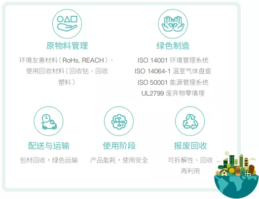 绿色制造 - ISO 14001 环境管理系统、ISO 14064-1 温室气体盘查、ISO 50001 能源管理系统、UL2799 废弃物零填埋