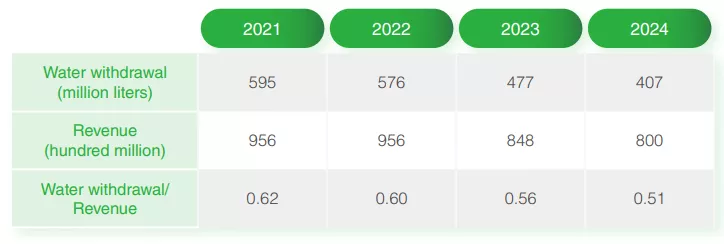 - Current status of target achievement: Water intensity (million liters/hundreds of million NTD revenue) decreased by 18.18% in 2024 compared to 2021.