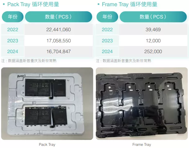 新普科技为降低制程时所产出的废弃物量,从 Tray 回收入手,包含 Pack 及 Frame Tray 循环再利用。以 Pack Tray 把电池模块提供给客户,客户在收到电池模块后,将电池 Tray 回收至委托的回收处理厂;回收厂针对回收的 Pack Tray 进行检验后,将可再用的电池 Tray 运回新普科技作为循环使用,2021 年计 28,524,870 PCS,2022 年计 22,441,060 PCS,2023 年 17,058,550 PCS,2024 年 16,704,847 PCS 投入循环使用。当 Pack Tray 在回收厂检验不符合使用需求后, 委由回收处理厂进行报废处理并作为二次料使用。