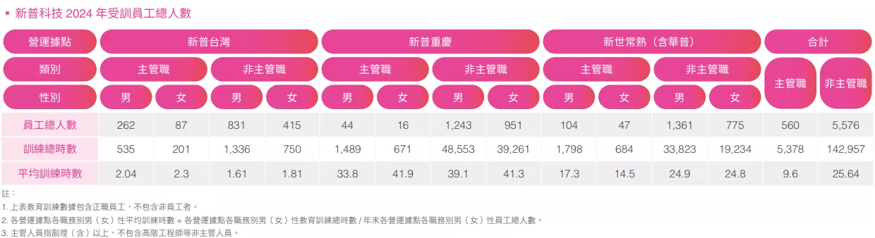 員工透過教育訓練,增長其專業知識與職能,並將其運用於工作中,達到適才適用。除了人資訓練外,另有品質系統、安全衛生等體系,針對不同業務功能人員所需的知識技能開辦年度課程,以確保各項作業安全、產品設計生產品質穩定或重要政策推展。2024 年教育訓練統計如下表: