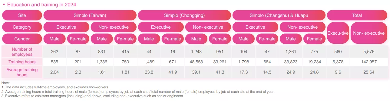 Through education and training, employees are able to increase their professional knowledge and functions, and apply them to their work to achieve the right fit for the job. In addition to HR training, there are also systems for quality, safety, and health that offer annual courses tailored to the knowledge and skills needed by personnel in different business functions. This ensures the safety of operations, stability of product design and production quality, or the promotion of important policies. The statistics for education and training in 2024 are as follows: