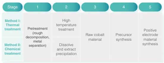 The main sources of recycled cobalt currently include production waste and marketrecycled batteries. There are primarily two methods (thermal treatment and chemical treatment) to extract cobalt compounds from these sources, which are them reused in positive electrode materials.
