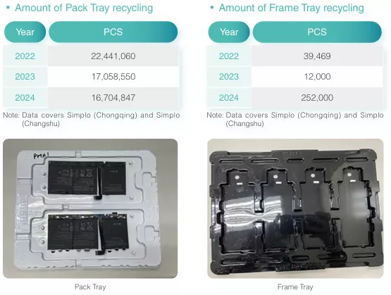 After the upstream supply chain receives the Frame, it recycles the Frame Tray and sells it to a recycling plant; after the recycling plant inspects the recycled Frame Tray, the supplier purchases reusable Frame Tray packaging products and ships them for recycling. In 2024, a total of 252,000 PCS have been put into recycling, gradually implementing circular economy.