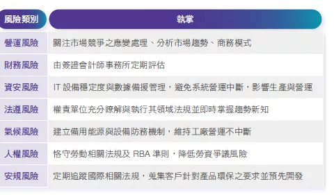 風險項目 運作情形 營運範疇 包括公司治理風險、信譽風險、策略風險、經營風險、人力資源風險或國內外重要政策及法律變動對公司永續經營之影響等。本公司每月都會進行集團營運管理檢討會議,針對營運面風險,做出鑑別及處理方針。 財務範疇 包括融資風險、投資風險、流動性風險、匯率及利率風險、資金貸與他人風險、背書保證風險、衍生性商品交易風險及財務決策風險等對公司財務之影響。財務管理部門定期對管理階層提出報告,監督風險與落實政策。 作業範疇 包括資通安全風險及職業安全衛生管理風險。(1)資通安全風險管理運作情形,請詳連結。(2)依職業安全衛生相關法規遴選出勞工代表,每季定期召開「安委會」,針對職業安全、衛生相關議題進行溝通、交流,以確保、維護職場工作環境之安全、衛生條件符合法規要求,並更為積極地尋求、實施持續優化之機會與作為。依法實施危害告知教育訓練(新進人員到職時或工作調整前)、自衛消防編組(每半年至少1次)、緊急應變演練(每年至少1次)等教育訓練活動。 環境範疇 包括氣候變遷風險。本公司已於110年10月成立企業永續委員會,每半年召開大會,持續執行循環經濟、綠色創新、關懷社會、誠信正直等議題的解決方案。 風險鑑別與運作