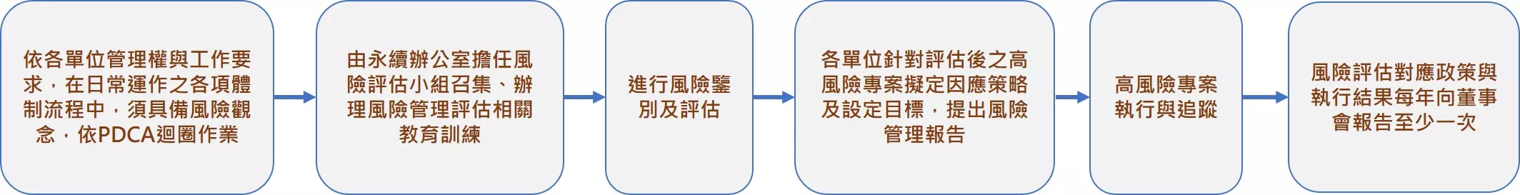 為強化「風險管理工作小組」對風險管理之認知,定期舉辦風險管理教育訓練,調訓人員包括:永續委員會,各部門主管。課程內容包含:全球風險趨勢、國際風險管理標準、金管會上市櫃公司風險管理守則,企業風險管理實務等議題。