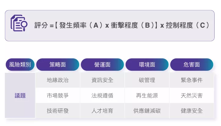 問卷內容參考國際趨勢、客戶要求,法規、同業資訊鑑別出「策略面」、「營運面」、「環境面」、「危害面」四大風險類別,再展開12項風險議題。