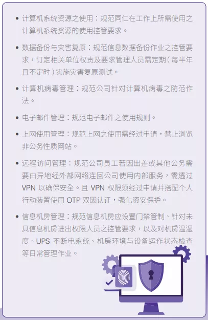 • 技术部署相关资安功能:包含网络防火墙、邮件安全系统、病毒防护系统、操作系统更新、系统弱点扫描等,以控制及降低资安风险