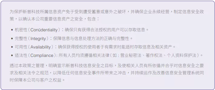 新普科技台湾总部于 2023 年导入信息安全管理系统 ( Information Security Management System, ISMS ),并取得第三方验证公司 ISO/IEC 27001 信息安全管理系统认证,验证的范围包含信息服务基础建设及信息管理作业流程,导入资安管理系统,不仅资安防护再升级,更能保障公司与客户之权益。2024 年已通过第三方 ISO 27001 续审稽核,持续遵循资安管理规范。