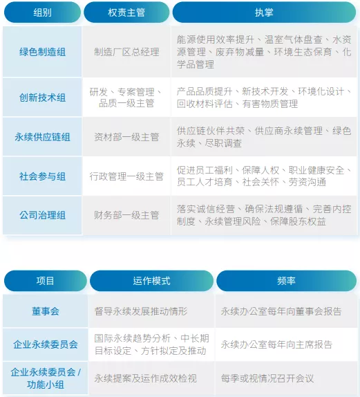 企业永续委员会 | 国际永续趋势分析、中长期目标设定、方针拟定及推动 | 永续办公室每半年向主席报告一次 |