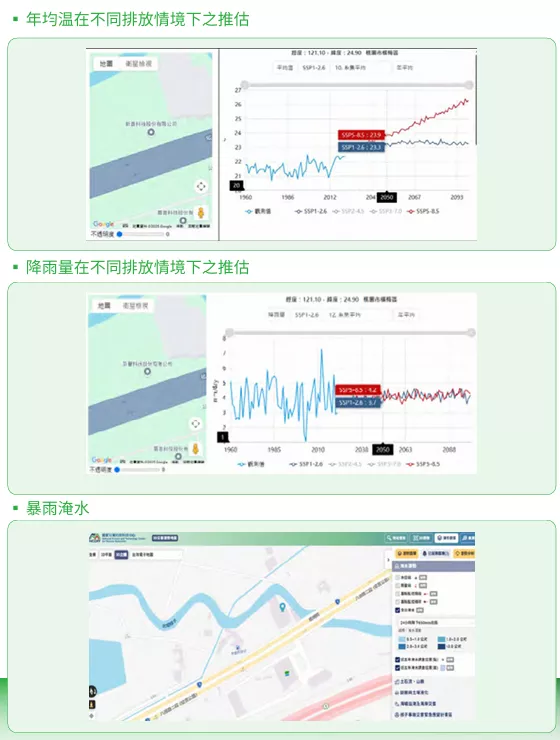 • SSP1-2.6 低排放情境、SSP2-4.5 中度排放情境、SSP3-7.0 高度排放情境、SSP5 8.5 极高排放情境等 4 个不同社会与经济情形的温室气体排放纳入考虑,推估至 2050 年新普台湾年均温、日最高温、降雨量等变化趋势。