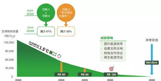 1. 通过SBTi (1.5 ℃ near-term)目标审查,以2020年为基准年,范畴1和2温室气体绝对排放量较2030年降低51%,范畴3「购买商品与服务」项目的温室气体绝对排放量减少25%。 2. 加入RE100,承诺2040年新普集团全球营运据点100% 使用再生能源。 3. 每年执行组织型 ISO 14064-1温室气体盘查及查证,审视排碳目标达成情形。 4. 持续与供货商议合,达成供应链管理目标。 |