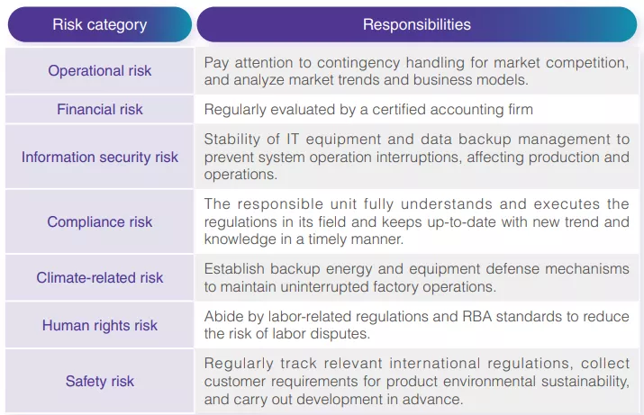Simplo regards the board of directors as the highest risk management organization, and had issued the "Risk Management Policy and Procedures" in 2021. Through management meetings of each departments, potential risks related to operations are identified and responded to.