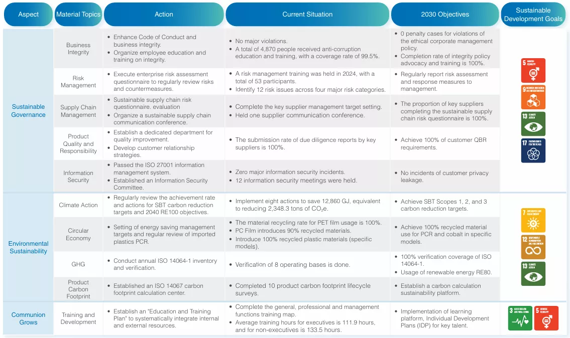 In order to respond to the United Nations Sustainable Development Goals (SDGs), Simplo identified 7 SDGs with its own core advantages through the consensus meeting of the company's senior executives, and summarized the development priorities of sustainable issues. Through internal communication and grasping the needs of stakeholders, Simplo was able to formulate short-, medium-, and long-term sustainable goals.