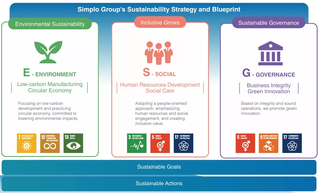 Simplo Technology Group Sustainability Policy" covers the three major aspects of ESG, and serves as the highest guidelines of Simplo's sustainable development to implement ESG and enhance the corporate competitiveness, launching the company toward corporate sustainable development.