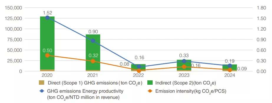 In 2024, the Simplo Group implemented a total of eight initiatives, achieving energy savings of 12,860 GJ, equivalent to a reduction of approximately 2,348.3 metric tons of carbon emissions. Through the collective efforts of all employees, the Group’s total Scope 1 and Scope 2 carbon emissions in 2024 decreased by 88% compared to the 2020 base year, thereby achieving the interim carbon-reduction target under the SBT framework.