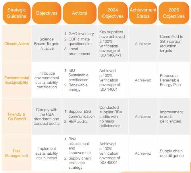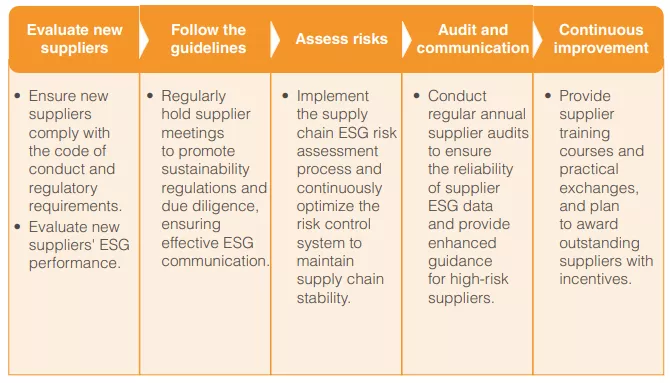 Global ESG sustainability issues continue to receive significant attention. Countries and companies are actively initiating carbon reduction actions in response to climate change, with many committing to net-zero emissions targets. The scope of carbon reduction efforts is also expanding to include supply chains. The Company implements the "Sustainable Due Diligence" mechanism by systematically identifying risks and engaging in the evaluation process to address environmental, social, and governance risks within the supply chain, and takes concrete management actions. At the same time, we continuously cooperate with suppliers to promote carbon inventory and reduce carbon emission actions, building a supply chain system that is resilient and has sustainable value.